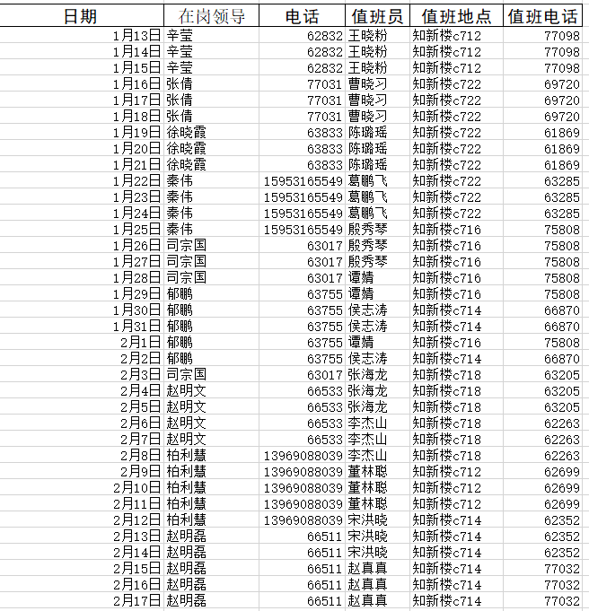 我院要高度重视值班值守工作,加强值班力量,提升值班工作水平。元旦法定假期白天(8:00—20:00)和寒假白天(8:00—18:00)由一名处级领导和一名工作人员在岗值班,夜间由该处级领导负责听班,并保持通讯畅通,及时处置各类突发状况。附值班表: