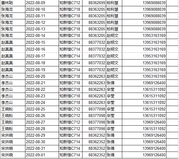 学院每天安排1名处级领导和1名工作人员白天(8:00-18:00)在岗值班,夜间(18:00-次日8:00)在校区驻地负责听班。附值班表如下: