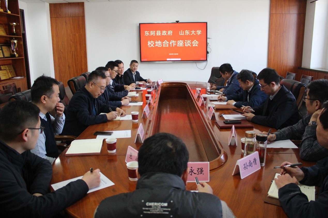 郁鹏首先代表学院对付晨副县长一行的到来表示热烈欢迎。付晨系统介绍了东阿县产业发展现状,重点围绕生物医药、装备制造、新能源新材料三大主导产业作了详细阐述,并向山大专家学者发出诚挚邀请,希望共同探索校地合作新机遇。