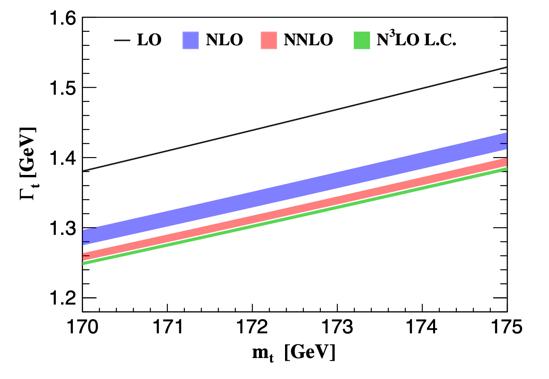 在该研究中,首先应用光学定理,把衰变宽度与顶夸克自能图的虚部联系起来,然后采用现代处理费曼圈积分的方法,把积分问题转化为解微分方程问题,并把结果用调和多对数函数(一种对数函数的多重积分推广)表示,同时公开发表了便于快速准确计算的程序包。采用顶夸克质量为172.69 GeV,得到最精确的顶夸克衰变宽度的理论预言值为1.321 GeV。对于其他顶夸克质量,理论预言结果如下图所示: