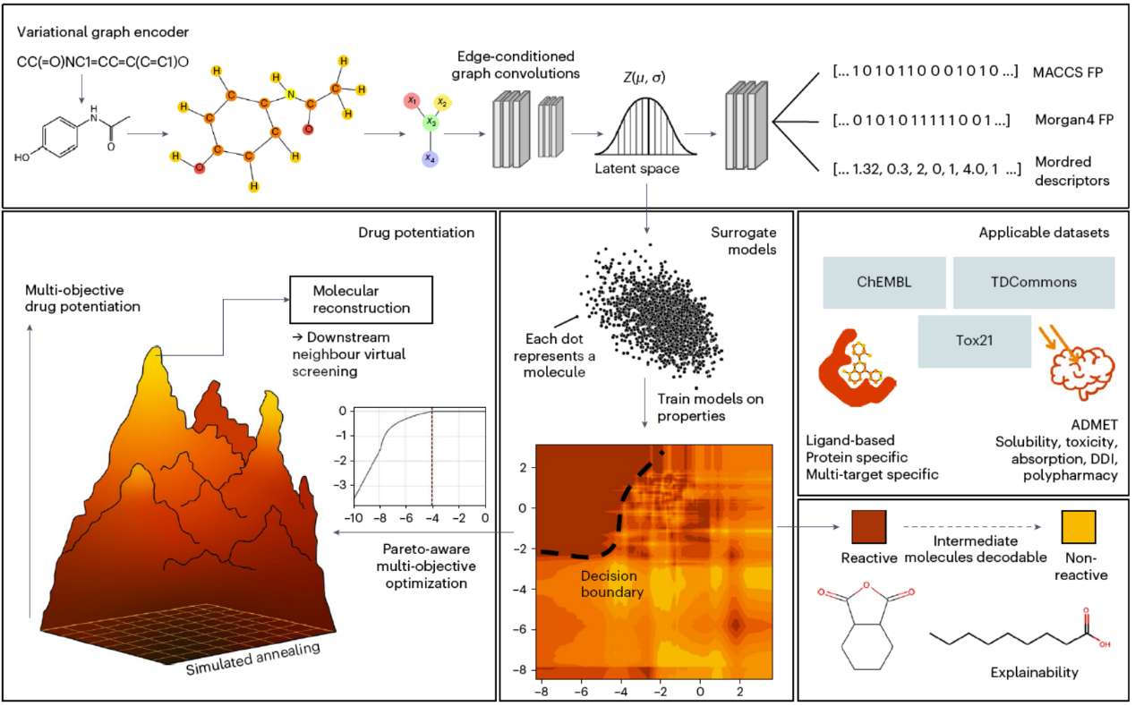 相关论文以“Application of variational graph encoders as an effective generalist algorithm in computer-aided drug design”为题发表于人工智能国际顶级期刊《Nature Machine Intelligence》。李伟峰教授与慕宇光教授(77779193永利集团兼职特聘教授)为共同通讯作者。